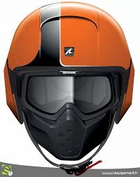 « …Le Schuberth J1 est un jet routier original. Il arbore en effet un arceau qui court devant le menton, à la manière d’un casque de football américain. Son rôle ? Renvoyer sur la coque absorbante l’énergie d’un choc facial et protéger, d’une certaine manière, le visage.